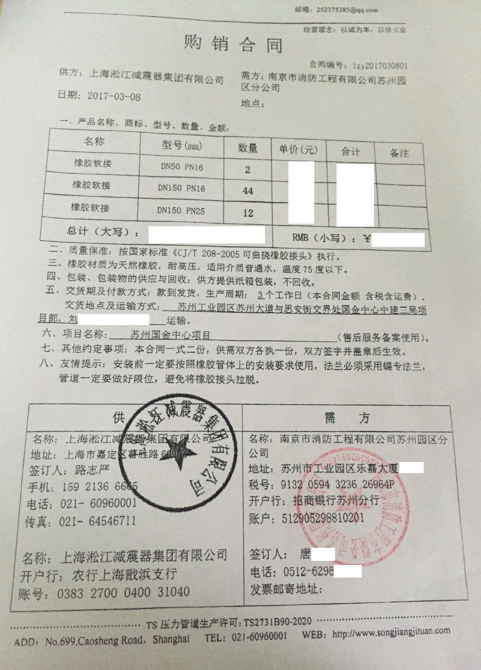 上海淞江減震器集團有限公司官方網(wǎng)站為您介紹:【江蘇.*高樓蘇州*金中心】消防用25kg橡膠接頭合同信息,這是淞江集團繼長沙*金中心項目之后又**金中心超高層項目案例,蘇州*金中心項目消防系統(tǒng)采用淞江25kg橡膠接頭,以下是詳細介紹。